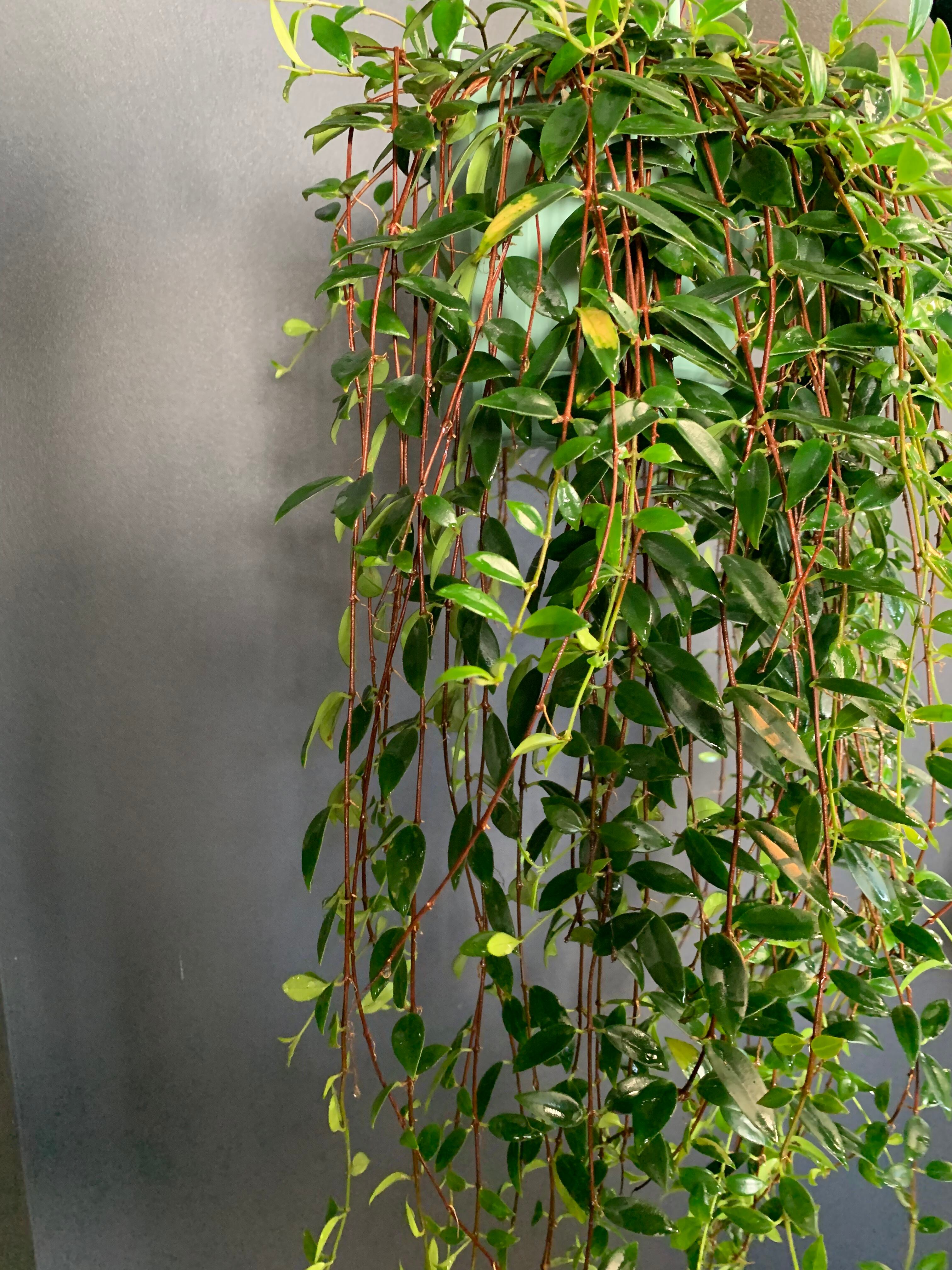 濃緑でつやのある小さめの葉をつけ、枝垂れる枝がきれいです。白い小花を咲かせ、そのあとにオレンジ色の実がつきます。