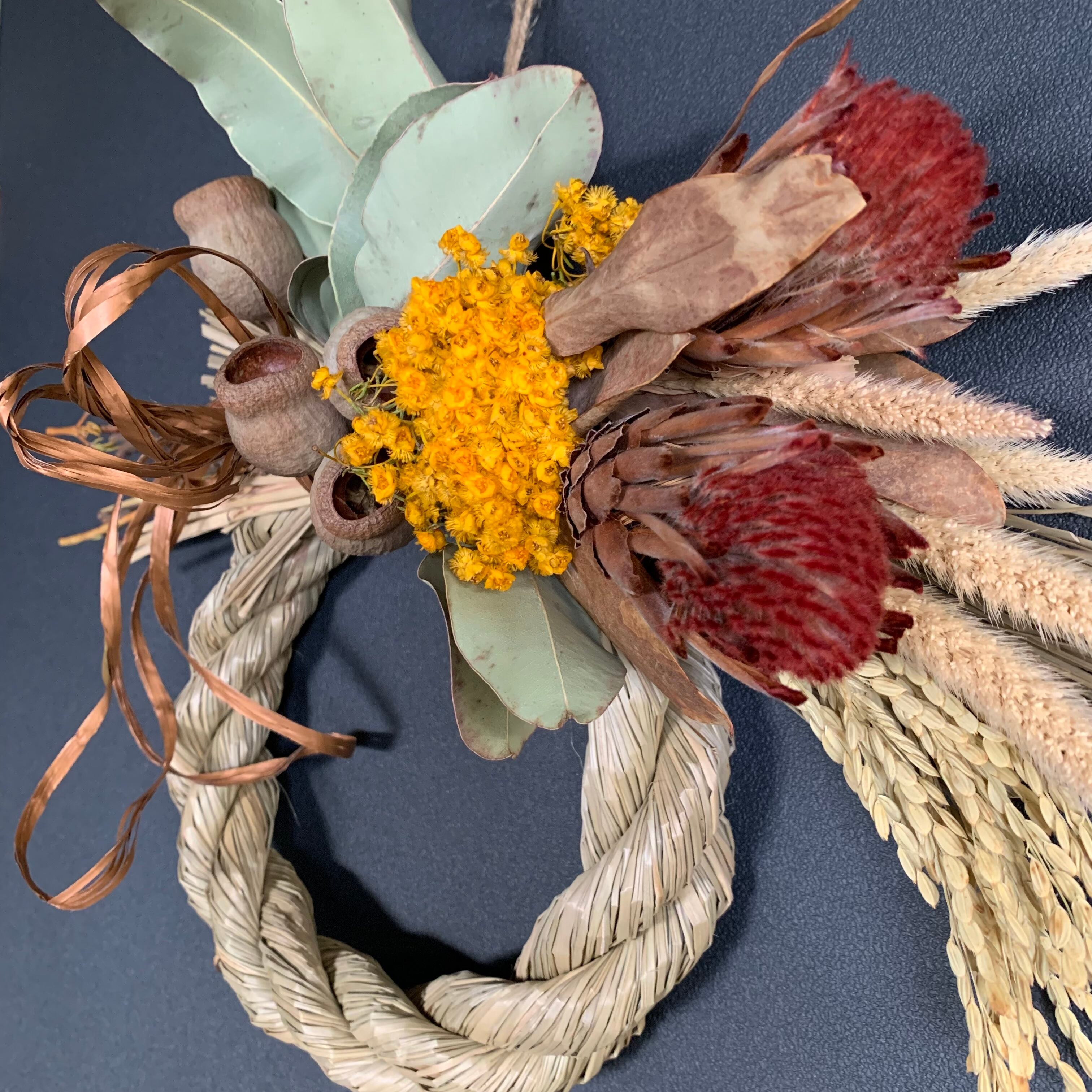 しめ縄リースをベースに、ドライフラワーの飾りをあしらったナチュラルなしめ縄飾りです。
